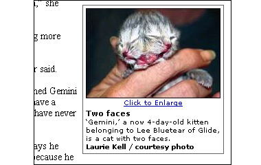 미국 오리건주에서 태어난 머리 둘 달린 고양이.('www.oregonnews.com' 화면캡쳐/노컷뉴스)