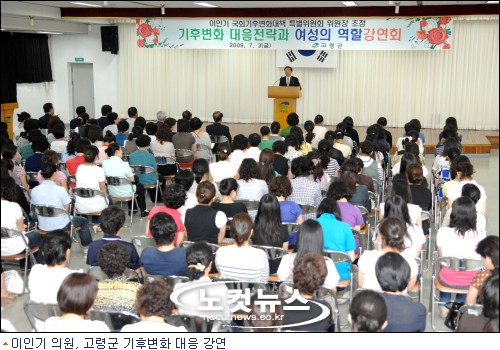 한나라당 이인기 의원은 3일 오후 경북 고령군청 강당에서 ''기후변화 대응과 여성의 역할''을 주제로 강연을 했다.