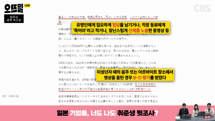 ◆ 박수정> **님께서도 "우리나라 회사에서도 SNS 계정 검색 돌려보는 거 다 하지 않나요?"라고 하셨는데 일본은 좀 다릅니다. 지금 일본 사회에서 이 서비스가 논란이 되고 있는 이유가 있는데요. 지원자의 공개된 SNS 계정만 보는 게 아니라 익명으로 사용하는 부계정까지 싹 다 조사한다는 거예요.