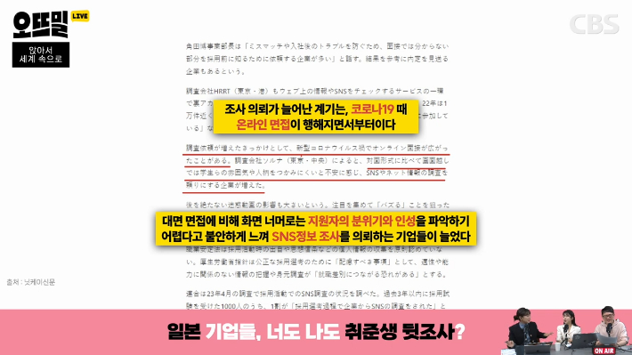 ◆ 박수정> 그런데 일본도 분위기가 비슷한가 봐요. 면접관들이 직접 얼굴을 봐야 인성을 파악할 수 있다는 분위기가 있었는데 코로나19 때 대면 면접을 못하고 온라인 면접을 하면서 너무 답답한 거예요. 내가 화면으로는 이 사람의 인성을 파악할 수 없다는 걸 불안하게 느껴서 SNS 정보 조사를 의뢰하는 기업이 늘었다고 합니다.