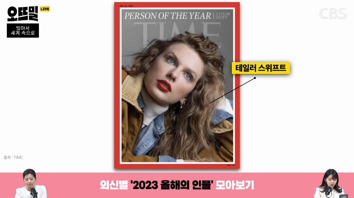 ◆ 박수정> 그렇죠? 첫 번째 인물은 지난주에도 살짝 언급한 적이 있는 인물입니다. 2023년 이 사람 하나만큼은 꼭 기억하고 가야 됩니다. 세계 최대 규모의 잡지 <타임지>에서 1927년부터 전 세계에서 가장 큰 영향력을 행사한 사람을 매년 올해의 인물로 선정하고 있는데요. 2023년에 미국의 팝스타 겸 작곡가 테일러 스위프트가 선정됐습니다.