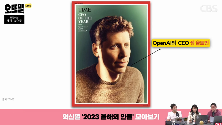 ◆ 박수정> 타임지의 올해 인물이 테일러 스위프트로 선정됐다면 올해 CEO도 따로 선정됐거든요. 챗GPT를 만든 회사, '오픈 AI'의 CEO, 샘 올트먼이 선정됐습니다. 인공지능을 상징하는 서비스, 챗GPT를 만든 사람이면서 또 동시에 그 회사에서 해고됐다가 복귀되는 해프닝을 겪은 인물로 올해 전 세계 뉴스를 쫙 도배했던 사람 중에 한 명입니다.