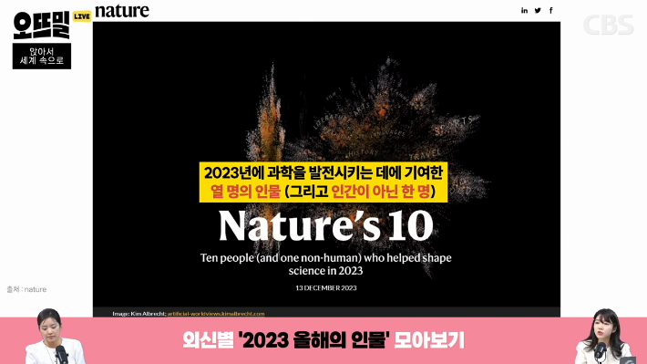 ◆ 박수정> 인공지능 얘기가 여기서 끝이 아니예요. 국제 학술지 <네이처>에서는 매해 Nature's 10이라는 리스트를 발표하는데요. 세계 과학계에 큰 영향을 미친 과학자 10명을 선정하는 거예요. 그런데 올해는 Nature's 10 밑에 보시면 '10명의 사람 그리고 인간이 아닌 하나'를 선정했다고 합니다. 그러니까 최초로 Nature's 10에서 사람이 아닌 기술을 선정한 건데 생성형 인공지능 챗봇, 챗GPT를 선정했습니다.