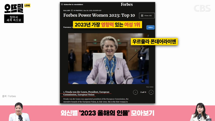 작년에 이어서 2년 연속 선정이 된 인물이고 여성 최초로 유럽연합 수장이 되었을 뿐만 아니라 작년에는 우크라이나 러시아 전쟁 상황에서 굉장히 강한 리더십으로 자유수호라는 원칙을 내세우는 지도력을 보여줬고요. 또 올해는 인공지능이나 세계 변화에 결정적으로 먼저 앞장서는 모습을 보였습니다.