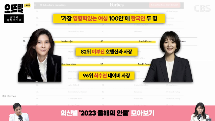 ◆ 박수정> <포브스>가 선정한 가장 강한 여성 100인에 한국인 2명도 포함됐는데 82위에 이부진 호텔신라 사장, 96위에 네이버 최수연 사장이 선정됐다고 합니다.