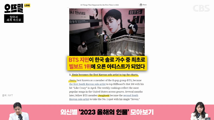 ◆ 박수정> <뉴욕타임즈>에서는 올해의 인물 이런 식으로 선정하지 않았는데요. 2023년에 처음으로 세상에 일어난 20가지의 사건들을 정리해놨어요. 세 번째 소식에 이 인물이 언급이 됐습니다. 바로 BTS의 지민인데요. "지민이 한국 솔로 가수 최초로 빌보드 1위에 오른 아티스트가 되었다." 이 사건을 꼽으면서 BTS의 지민이 빌보드 1위에 올랐고 몇 달 뒤에 같은 그룹의 멤버인 정국이 그 기록을 이어받았다고 하면서 그동안 K-POP 그룹이 선전하다가 K-POP 솔로 아티스트들도 전 세계에서 인정을 받은 해라고 하면서 지민을 선정했습니다.