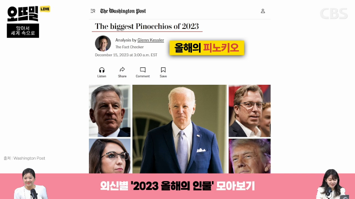 ◆ 박수정> <워싱턴 포스트>는 올해의 인물 대신에 올해의 피노키오를 선정을 했습니다. '피노키오 2023'이라고 발표를 했는데요. 한 해 동안 피노키오처럼 가장 거짓말을 많이 한 인물들을 선정한 거죠. 공인들이 하는 말의 진위를 가리는 팩트체커 팀이 <워싱턴 포스트>에 따로 있거든요. 그래서 사무실에 실제로 피노키오 목각 인형을 가져다 두고 있대요. 정치인들이 거짓말을 많이 할수록 피노키오 지수를 높여서 측정한다고 하는데요. 얼마나 과장을 하고 얼마나 거짓말을 하는지를 검증하는 부서죠. 올해 리스트에는 미국의 전·현직 대통령이자 내년 미국 대선에서 겨루게 될 가능성이 높은 두 사람 조 바이든 미국 대통령과 도널드 트럼프가 사이좋게 이름을 올렸습니다.