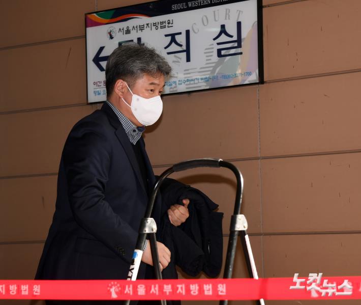 이태원 참사 증거인멸교사와 공용전자기록 등 손상 교사 혐의로 기소된 김진호 전 용산경찰서 정보과장과이 14일 오후 서울 마포구 서부지법에서 열린 1심 선고공판에서 징역 1년에 집행유예 3년을 선고 받은 후 법원을 나서고 있다.