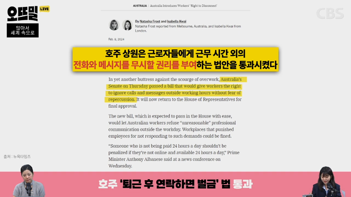 ◆ 박수정> 근무 시간이 아닐 때 일하는 걸 그림자 노동이라고 표현한대요. 그 그림자 노동을 없애겠다, 근절하겠다는 취지라고 하는데 호주 총리가 이 법안에 관해서 설명하면서 24시간 내내 급여를 받는 사람이 아니라면 24시간 내내 답장할 필요가 없다고 했어요. 그러면서 이 근로자들을 과로라는 재앙으로부터 보호하기 위한 법안이라고 설명을 덧붙였다고 합니다.