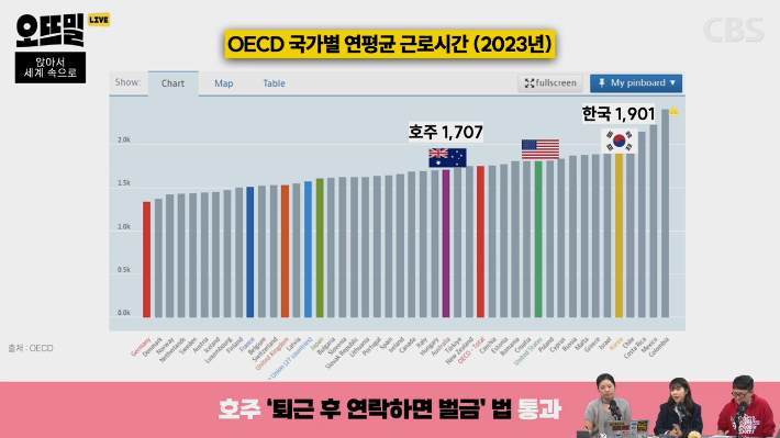 ◆ 박수정> 과로를 재앙으로까지 표현하길래 어느 정도인지 보려고 OECD 자료를 좀 찾아봤거든요. OECD 회원국들을 대상으로 한 작년 통계를 보면, 연평균 근로 시간이 호주는 1,707시간이에요. 그래서 OECD 평균인 1,752시간보다는 적습니다. 유럽의 프랑스나 독일이나 EU 평균과 비교했을 때는 더 높은 수준이긴 한데 한국은 1,901시간이에요. 우리나라보다 근로 시간이 높은 나라가 칠레, 코스타리카, 멕시코, 콜롬비아밖에 없어요. 그래서 우리는 가장 높은 순으로 했을 때 5위입니다.