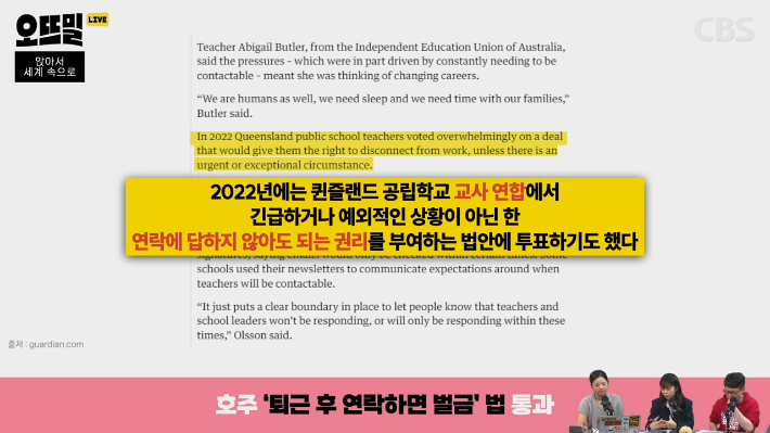왜냐면 호주에서도 우리나라와 좀 비슷하게 퇴근 후에 학부모들에게 오는 연락에 시달리는 공교육 교사들이 그만두는 일이 최근 몇 년 사이에 많았대요. 그래서 그 교사들이 모여서 공립학교 교사들이 예외적인 상황이 아니면 연락하지 않게 해달라고 하는 그런 법안에 투표하기도 했고요. 근데 이런 법이 시행돼서 이제 교사들이 좀 자유로워질 것이라고 기대하고 있습니다.