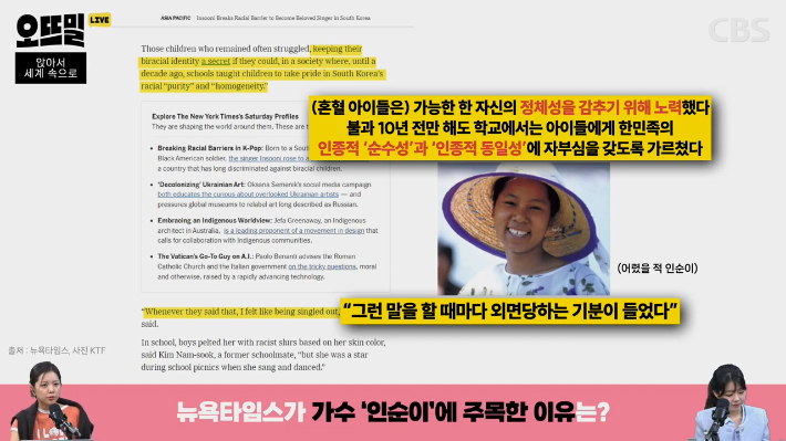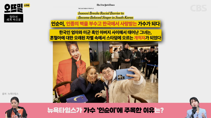 헤드라인을 보시면 인순이 씨를 어떤 시선으로 분석을 했는지 보실 수 있어요. 혼혈아에 대한 오래된 차별 속에서 인기 대열에 오른 개척자라고 하면서 한국에서 사랑받는 혼혈 가수로서 인순이의 삶을 깊게 다뤘어요. 그녀의 삶, 그리고 40년이 넘는 가수 생활, 연예계 생활을 통해서 그 사이에 한국 사회에도 큰 변화가 있었다, 특히 한국이 단일민족 국가에서 다문화 국가로 빠르게 변화 중이라는 점을 지적하고 있습니다.