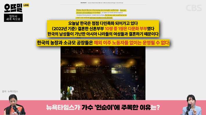 ◆ 박수정> 차별이 심했던 1978년부터 가수로 활동을 시작을 해서 지금까지 46년 동안 가수 활동을 했는데요. 그 사이에 인순이 씨는 한국의 명실상부한 국민 가수가 됐잖아요. 그럼 이제 그런 혼혈아에 대한 차별이 다 없어졌을까요? 그 질문에 뉴욕 타임스의 대답은 'NO'인 것 같습니다. 기사에서는 '그녀가 활동하는 40년 사이에 대한민국은 급격하게 다민족 사회로 다문화 사회로 변화를 했지만 혼혈아를 향한 차별적인 시선은 아직 과거에 머물러 있는 수준'이라고 지적합니다.