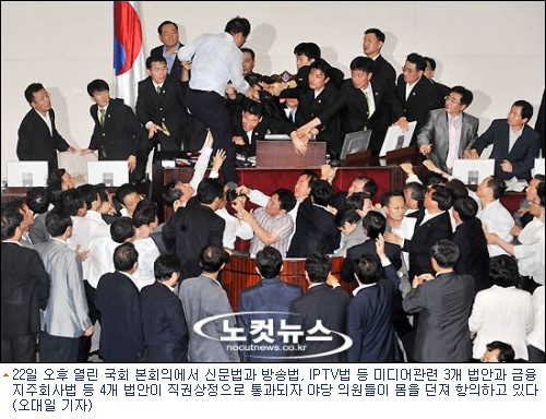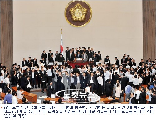 18대 국회의 최대 쟁점인 미디어법안이 결국 직권상정돼, 한나라당 의원들만의 표결로 강행 처리됐다.