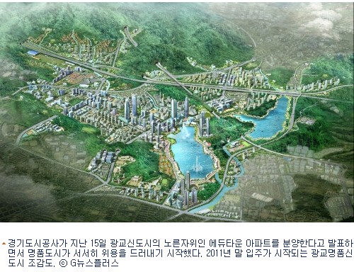 총 사업비 9조4천억원을 들여 수원시 이의동, 용인시 상현동 일원에 1130만1천699㎡ 규모로 조성되는 광교신도시는 2008년 9월 첫 분양을 시작해 2011년 말 입주가 이뤄진다. 수용인구는 3만1천세대, 7만7천500명.