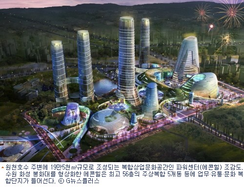 19만5천㎡ 규모의 복합상업문화공간인 파워센터(에콘힐)도 원천호수 주변에 조성돼 남부 수도권의 대표적 상권으로 육성된다. 수원 화성 봉화대를 형상화한 에콘힐은 최고 56층의 주상복합 5개동 등에 업무·유통·문화 복합단지가 들어선다.