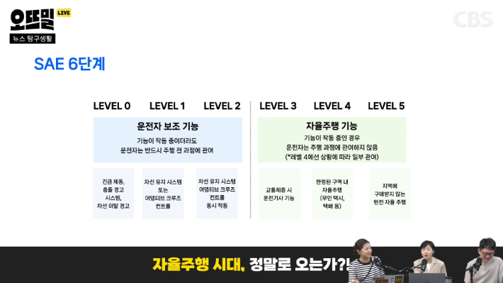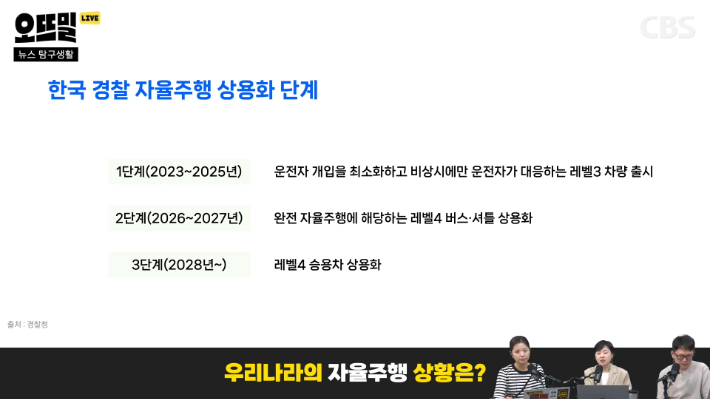 ◆ 신혜림> 오게 될 미래라고 보고 있는 것 같아요. 그래서 제도 정비도 시작했습니다. 경찰이 자율주행 상용화 시기를 3단계로 구분을 했어요. 1단계가 지금입니다. 2023~ 2025년, 운전자 개입을 최소화하고 비상시에만 운전자가 대응하는 레벨3 차량이 출시되는 시기라고 보고 있고요. 2단계가 2027년까지인데 이때부터는 완전 자율주행에 해당하는 레벨4, 4단계의 버스나 셔틀이 상용화되는 시기입니다. 그리고 3단계가 2028년부터인데 이때부터 4단계 승용차가 상용화될 거라고 하니까 자율주행 택시도 이때쯤 도입될 수도 있다는 얘기죠.