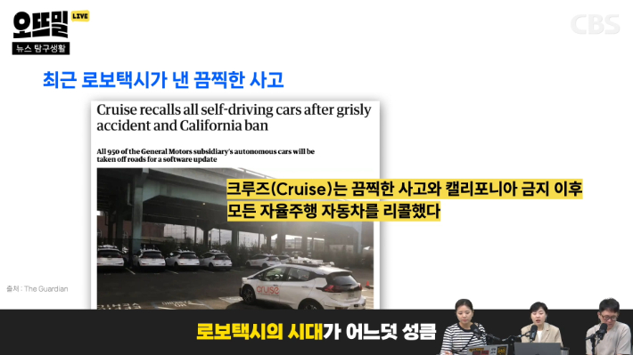 ◆ 신혜림> 맞아요. 이게 일반인이 탈 수 있게 되는 거잖아요. 지금 출범 이후에는 안전하고, 뭔가 사생활이 지켜지는 것 같다, 그래서 좋다는 반응도 많았어요. 그런데 지난 10월에 큰 사건이 하나 일어납니다. 로봇 택시 대표 업체 중 하나인 GM의 계열사 크루즈의 로보택시가 샌프란시스코 시내에서 대형 사고를 낸 거예요. 로보택시가 소프트웨어 결함으로 무단횡단 보행자를 쳤어요. 무단횡단 보행자다 보니까 이걸 인식을 못한 거죠. 그래서 보행자를 친 뒤에도 엄청 길게 끌고 가는 끔찍한 사고였습니다.