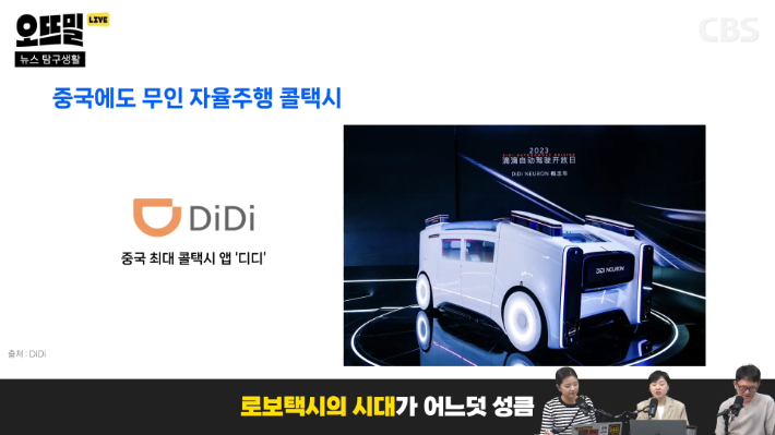 ◆ 신혜림> 미국과 중국이 2강 체제를 이루고 있는 건데 최근에는 중국 최대 콜택시 앱 디디라는 곳에서 인공지능 무인자율주행 서비스가 내년부터 본격 진행된다는 소식이 나왔습니다. 중국 정부 승인을 획득해서 내년부터 4단계의 자율주행 차량을 양산하겠다고 합니다.