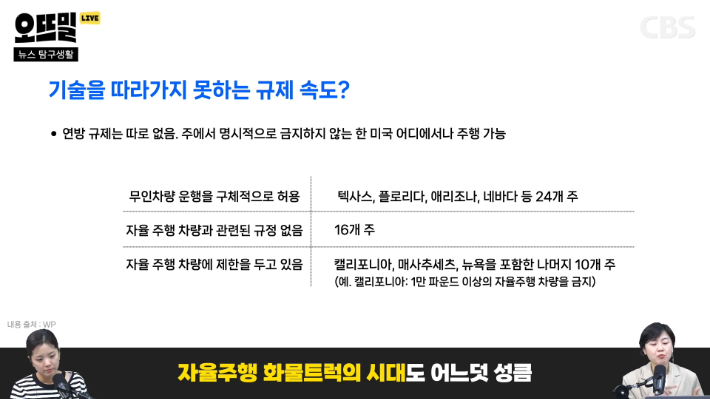 ◆ 신혜림> 그런데 기술이 상용화되는 속도에 비해서 규제를 손 보는 속도가 너무 느리다고 워싱턴 포스트가 지적합니다. 미국이 나라 전체를 아우르는 연방 규제가 있고 주별로 규제가 있잖아요. 그런데 연방 규제는 일단 별다른 게 없어요. 즉, 주에서 명시적으로 금지하지 않는 한 미국 어디서나 자율주행 차량이 다닐 수 있는 겁니다. 그리고 주별로 보면 텍사스나 플로리다, 애리조나, 이런 24개 주가 무인 차량 운행을 구체적으로 허용을 하고 있고요. 16개 주는 자율주행 차량과 관련된 규정이 따로 없습니다. 그러면 해도 된다는 거죠.