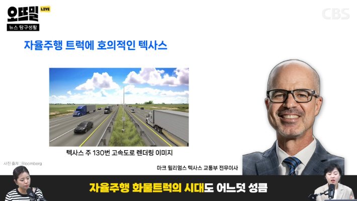 ◆ 신혜림> 아무래도 일자리겠죠. 텍사스가 자율주행 트럭에 호의적이라고 말씀드렸잖아요. 미국 최초로 자율주행 화물 트럭을 위한 고속도로가 개통할 예정이기도 합니다. 텍사스 교통부의 마크 윌리엄스는 "자율주행 화물 트럭이 텍사스의 경제 성장에 매우 중요하다. 대규모 일자리 손실 우려를 하고 있는데 그건 잘못된 것일 수도 있다"고 말합니다. 텍사스 교통부의 2021년 연구에 따르면 자율주행 트럭 운송으로 인해 향후 5년 동안 장거리 운전자 인력의 약 2%만 해고가 된다는 건데, 2%가 한 1만 천 명 정도입니다.
