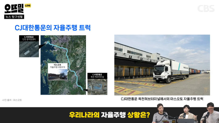 ◆ 신혜림> 지금 물류도 계속해서 테스트를 하고 있었어요. CJ 대한통운 같은 경우에는 자율주행 스타트업이랑 계속 협력을 해왔고 다음 달 말부터 1년간 더 구체적인 실행 계획을 가지고 있다고 합니다. 그래서 실제 택배 상품을 실은 11톤의 대형 트럭이 고속도로 비중이 93% 정도를 차지하는 비교적 쉬운 노선, 인천에서 옥천허브까지 가는 그런 간선 노선을 주 6회씩 운영하게끔 시범 운영을 하게 할 거라고 합니다. 도심 구간만 수동운전을 하고 운전자는 비상 상황을 대비해서 탑승은 하는데 그래도 93%는 자동으로 가는 거죠,