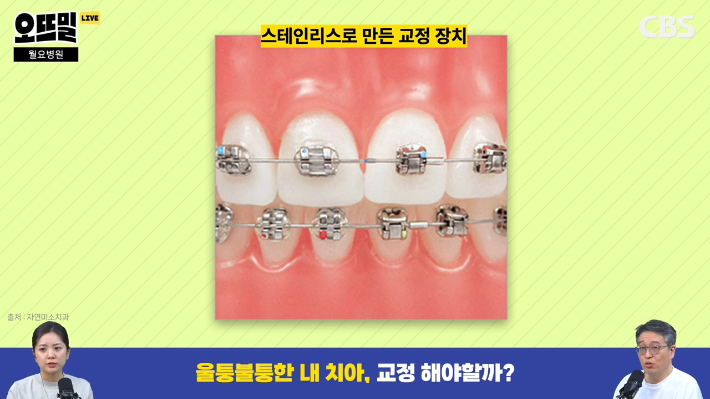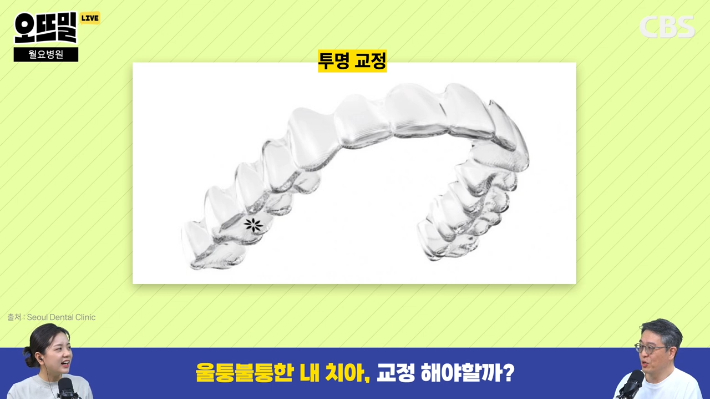 ◇ 채선아> 앞니가 빠지는 시기를 보고 그다음에 병원에 가서 진단을 받아보시라는 말씀이고, 교정 장치 종류도 너무 많거든요. 우리가 '철길'이라 부르는 쇠로 생긴 장치들이 있고 투명 교정기도 요즘 안 보이게 낄 수 있다고 하고 이런 장치들을 어떻게 고르는 게 좋을지도 궁금하더라고요.