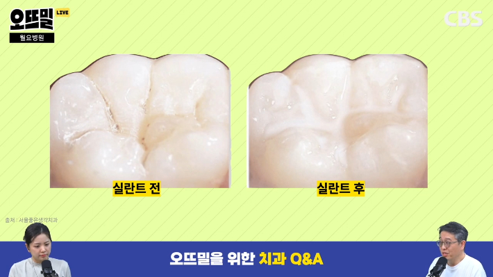 ◇ 채선아> 목욕탕 같은 데 가면은 소금 이렇게 찍어가지고 양치하시는 분들 있는데 소금으로 이를 문지르시는 건 절대 안 된다는 말씀이네요. "치과에서 실란트, 치아 홈 메우기를 하라고 권하는데 꼭 받아야 하나요?"라는 질문도 있는데 일단 실란트가 뭔가요?