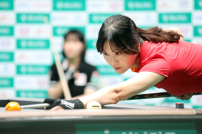김상아가 6일 경기도 '고양 킨텍스 PBA 스타디움'에서 펼쳐진 '하나카드 PBA 챔피언십' 여자부 4강전에서 정수빈을 상대로 신중하게 샷을 구사하고 있다. PBA프로당구(PBA)에서 차세대 미녀 스타의 돌풍이 관록에 막혔다. '엄마 선수' 김상아가 정수빈(NH농협카드)를 누르고 생애 첫 우승에 재도전한다.