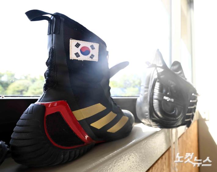 2024파리 하계 올림픽대회를 일주일 앞둔 19일(현지시간) 프랑스 퐁텐블로시에 위치한 프랑스국가방위스포츠센터(CNSD)에 마련된 팀 코리아 파리 플랫폼 복싱 훈련장. 한 선수의 복싱화에 태극마크가 붙어 있다. 파리 플랫폼은 올림픽선수촌으로부터 84㎞ 떨어진 퐁텐블로시 프랑스국가방위스포츠센터에서 선수단의 원활한 현지 적응을 위한 국가대표선수촌과 동일한 수준의 훈련·영양·의료 서비스를 제공한다. 2024.7.19 퐁텐블로=올림픽사진공동취재단