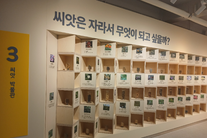상설 전시공간은 다양한 종자와 나무줄기, 우리나라 특산식물과 멸종위기 식물 등이 전시된 생태교육 공간으로 꾸며졌다.