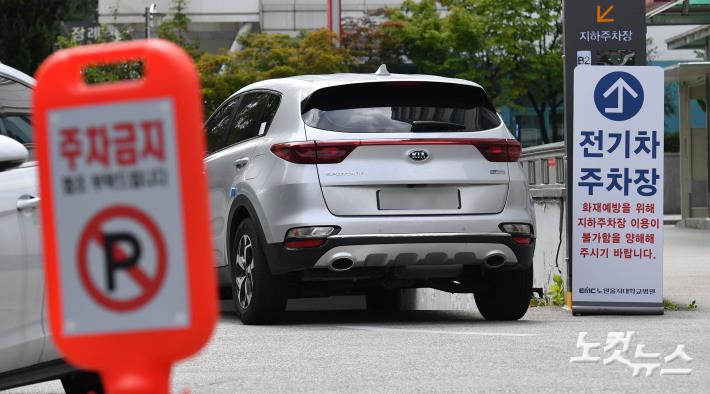 최근 전기차 화재가 잇따르며 불안감이 높아지고 있는 가운데 16일 서울 노원구 노원을지병원 지하주차장 입구에 전기차는 지하주차장 이용이 불가능하다는 안내문이 세워져 있다.