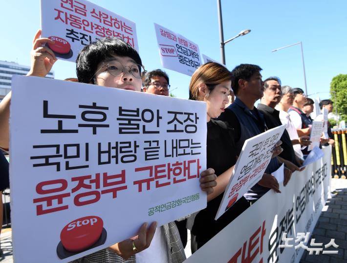 공적연금강화국민행동 관계자들이 30일 오전 서울 용산구 대통령실 인근에서 ‘노후파탄·분열조장 윤석열 정부 연금개악안 규탄 기자회견’을 열고 발언을 하고 있다.