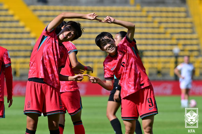 U-20 여자 축구 대표팀의 세리머니. 대한축구협회 제공20세 이하(U-20) 여자 축구 대표팀의 16강 상대가 콜롬비아로 결정됐다.