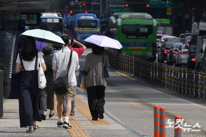 서울에 사상 첫 '9월 폭염경보'가 내려진 11일 서울 광화문사거리에서 양산을 쓴 시민들이 발걸음을 옮기고 있다.