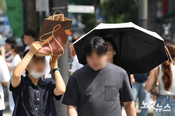 서울에 사상 첫 '9월 폭염경보'가 내려진 11일 서울 광화문사거리에서 한 시민이 쇼핑백으로 햇빛을 가리고 있다.