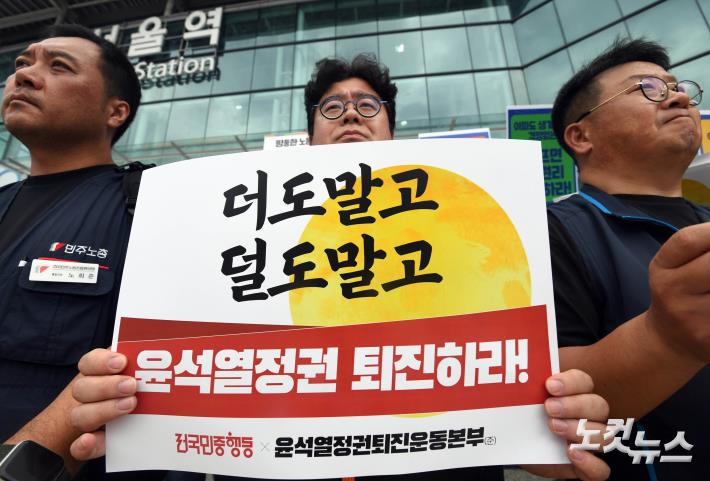 13일 오전 서울역에서 열린 ‘윤석열 정권 퇴진, 2024 추석맞이 기자회견’ 참석자들이 구호를 외치고 있다.