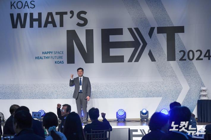 국내 사무가구 기업 코아스 민경중 대표가 18일 서울 영등포구 그랜드컨벤션센터에서 열린 'WHAT`S NEXT 2024' 비전 선포식에서 인사말을 하고 있다. 코아스는 이날 내실 경영 강화와 전통 제조업에서 고객중심의 서비스기업으로 탈바꿈하기 위한 신경영을 선언하는 한편 글로벌 기업으로 나아가기 위한 전략을 소개했다.