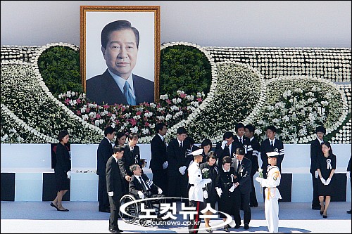 故 김대중 전 대통령의 국장 영결식이 열린 23일 오후 서울 여의도 국회 앞 광장에 마련된 영결식장에서 이희호 여사를 비롯한 유가족들이 마지막 헌화를 하고 있다.