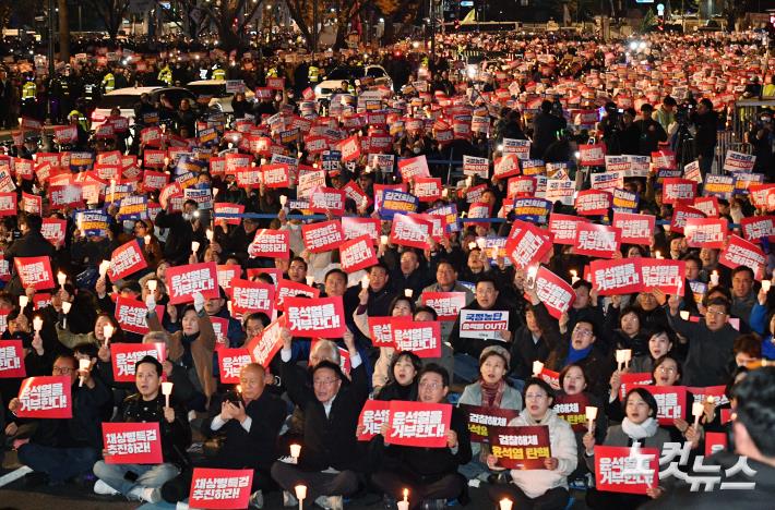 23일 오후 서울 종로구 광화문 북측광장 인근에서 열린 '김건희·윤석열 국정농단 규탄·특검 촉구 제4차 국민행동의 날' 집회 참석자들이 구호를 외치고 있다.