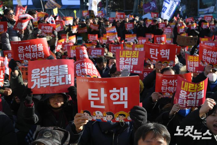 윤석열 대통령 탄핵소추안 표결을 앞둔 7일 서울 여의도 국회 앞에서 시민들이 윤 대통령 탄핵 구호를 외치고 있다.