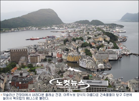 8월 24일 아침, 비가 추적추적 내리는 가운데 전용버스를 타고, 올레순 시내 동쪽에 우뚝 솟아 있는 악슬라산 정상의 전망대로 향했다. 3개의 섬으로 이뤄진 올레순 시가지와 아루누보 양식의 우아한 건축물들이 한눈에 들어왔다. 3개의 섬은 각각 다리와 터널로 연결되어 있다. 섬 주위는 바다로 둘러싸여 있고, 바다와 맞닿아 있는 항구에는 아름다운 건축물들이 죽 늘어서 있어 북유럽의 베니스로 불리운다.