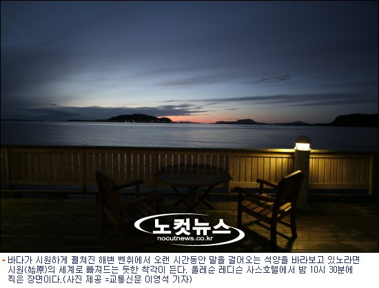 8월 23일 저녁, 게이랑에르 피오르드의 거점인 올레순에 도착했다. 올레순은 잿더미에서 예술적 건축도시로 변모한 것으로 유명하다. 바로 앞에 바다가 보이는 ''''래디슨 사스'''' 호텔에 여장을 풀고 곧바로 저녁식사를 하였다. 환한 조명의 레스토랑과는 대조적으로 창밖은 어스름하게 어둠이 깔리고 있었다. 시원하게 펼쳐진 바다의 저 끝 하늘에는 하루일과를 마쳐가는 해가 구름과 대화를 나누고 있었다. 연어요리와 맛있는 맥주로 저녁을 즐긴 뒤 호텔 야외 탁자로 향했다. 의자에 편한 자세로 몸을 누인 채 노을이 지는 바다를 지긋이 바라보며 후배와 담소를 한참 나눴다. 후배가 쉬겠다며 자리를 먼저 떴다. 그 때 시각이 밤 10시 30분인데도 바다 수면위로 석양의 황금빛 잔영이 남아 있었다. 우리는 ''''이곳은 석양이 참 길다''''고 맞장구를 쳤다. 이윽고 노을이 검은 색으로 바뀌었다. 나는 야외 의자에 누워 담요를 덮은 채 시원한 갯바람을 맞으며 1시간을 더 보낸 뒤 객실로 돌아왔다. 어둠에 싸인 밤하늘에 출렁거리는 물소리만 들리는 이국의 바닷가에서 홀로 깨어 있는 느낌은 ''충만함'' 그 자체였다.