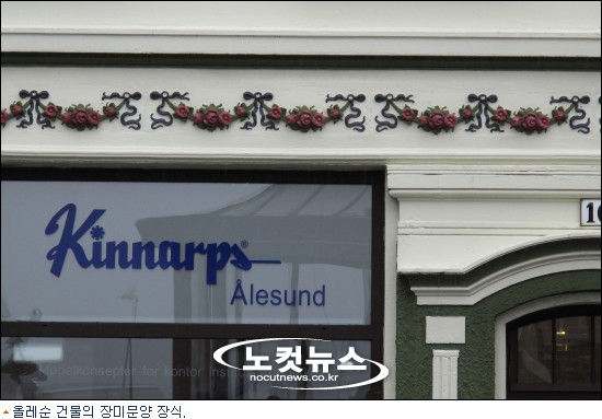 올레순 건물은 문양 하나하나에도 세심한 신경을 쓴 흔적이 드러난다. 지혜의 신 미네르바를 상징하는 부엉이 문양의 부조, 장미꽃 문양, 나무문양의 부조 등 다양하다. 건물간판이나 입간판 역시 디자인이 심플하다. 이곳에서는 집을 지을 때 목재를 써서는 안 되고, 반드시 석재를 써야 한다. 다시는 화마를 겪지 않기 위해서이리라.