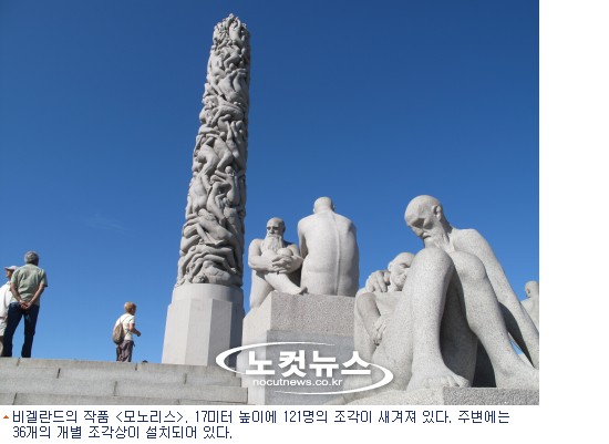 8월 23일 오전, 푸른 하늘에 햇볕이 쨍하고 약간 후텁지근한 날씨에 비겔란드 조각공원(Vigelandsparken)을 찾았다. 오슬로 시내에서 약간 떨어진 곳에 있는 이 공원은 공원 곳곳에 조각작품이 놓여 있다. 조각가 구스타프 비겔란드(1869-1943년)의 이름을 딴 이 공원은 비겐란드 한 작가의 작품으로 거의 채워져 있다.