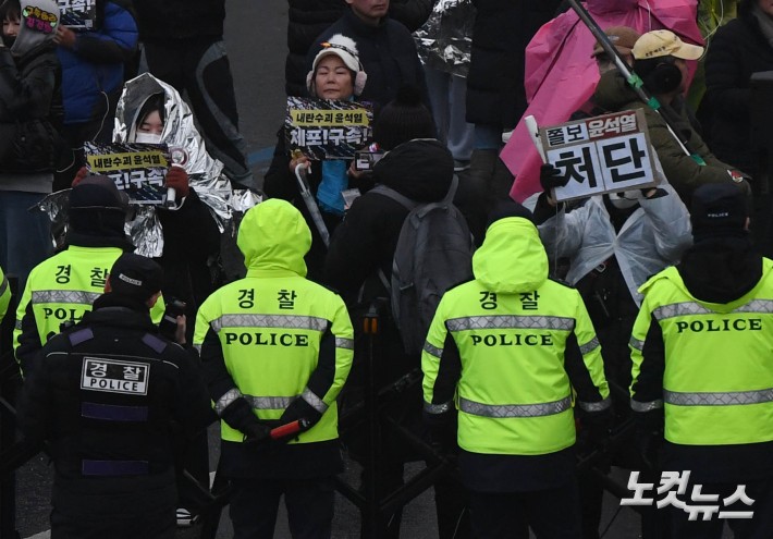 윤석열 대통령 체포영장 만료 시한인 6일 오전 서울 용산구 한남동 대통령 관저 인근에서 시민들이 윤 대통령 체포를 촉구하고 있다.