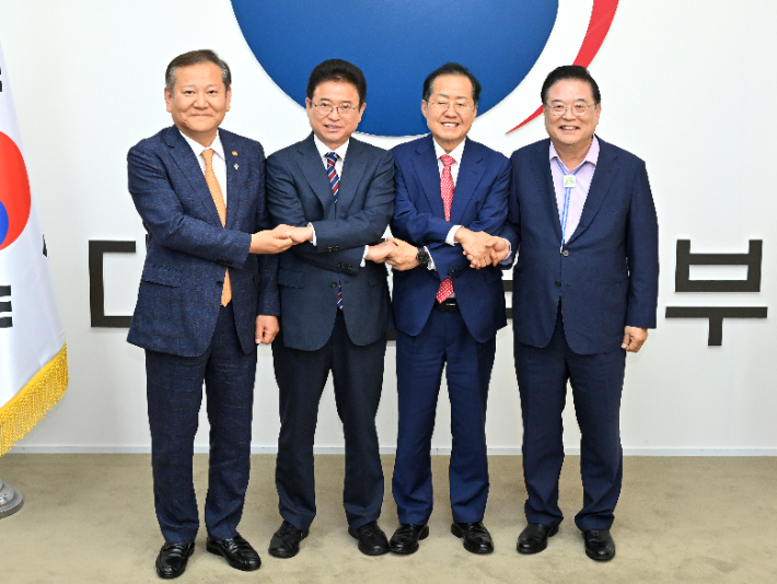 지난해 6월 열린 행정통합 추진을 위한 4자 회동 모습. 경북도 제공대구경북 행정 통합을 위한 특별법 제정 작업이 정국 혼란 상황으로 지연되고 있다.