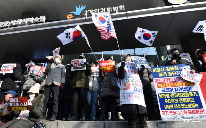 윤석열 대통령 지지자들이 10일 서울 중구 국가인권위원회에서 열리는 2025년 제2차 전윈위원회를 앞두고 입구에 모여있다. 이날 인권위는 2차 전원위원회에서 '계엄 선포로 야기된 국가적 위기 극복 대책 권고의 건'을 상정할 예정이다.