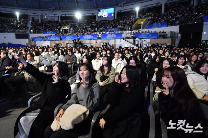 24일 오후 서울 중구 장충체육관에서 열린 2025 숙명여자대학교 입학식에서 신입생들이 기념촬영을 하고 있다.