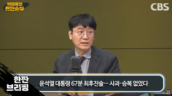◇ 박재홍> 네, 김웅 전 의원님, 박성태 실장님 두 분도 어서 오십시오. 윤석열 대통령이 어젯밤 탄핵 심판 최종 변론에서 67분간 발언을 했습니다. 최후 진술이었는데요. 주요 내용을 영상으로 듣고 이어갑니다.